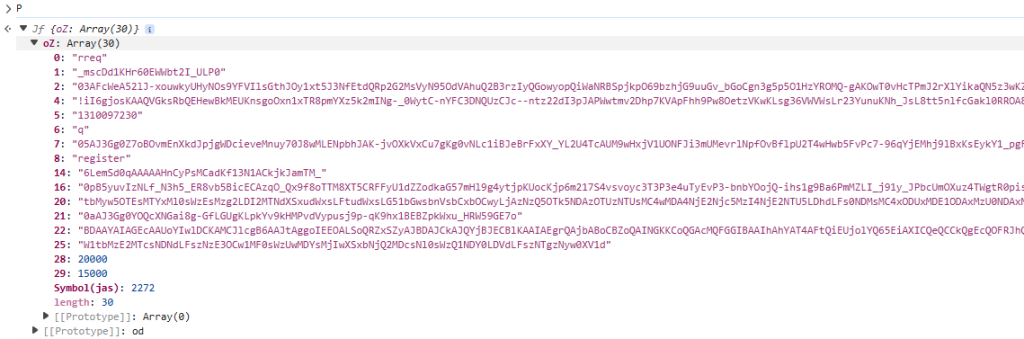 ok,进入我们的加密流程中了,这里定位的话,大家直接打一个 xhr 断点,然后往回跟栈,就能看到一个26位数组(现在有一部分网站已经是30位了)的加密,从这个加密点往回走或者往下走都是一个不错的选择。